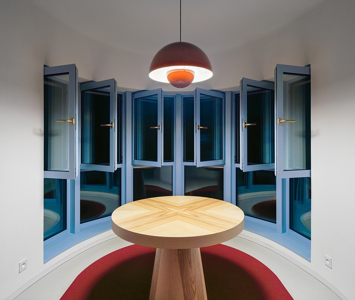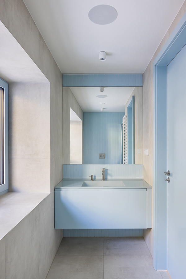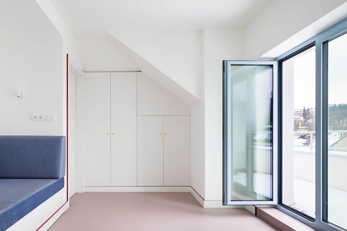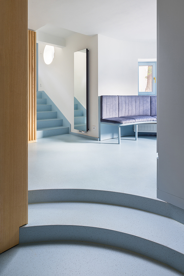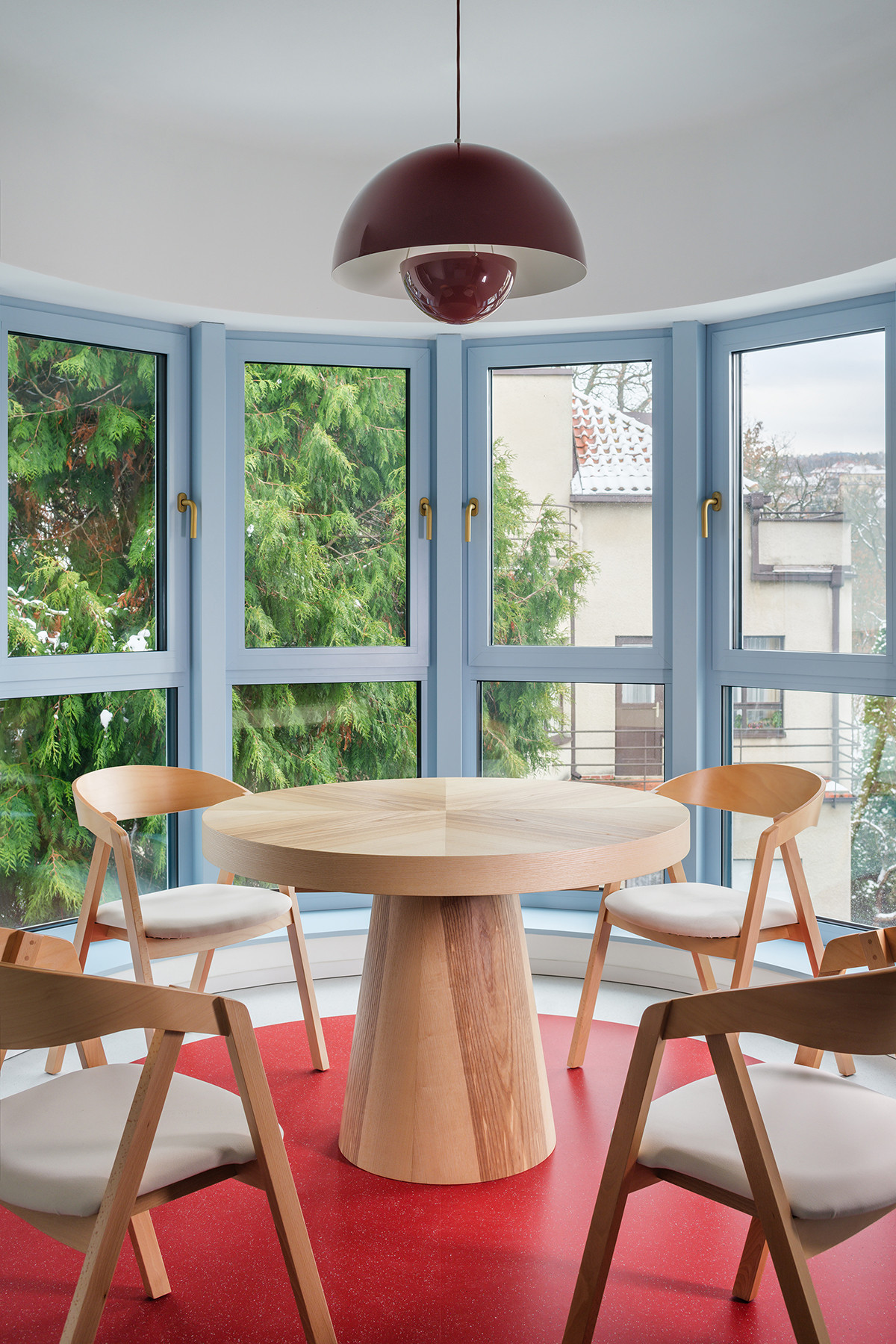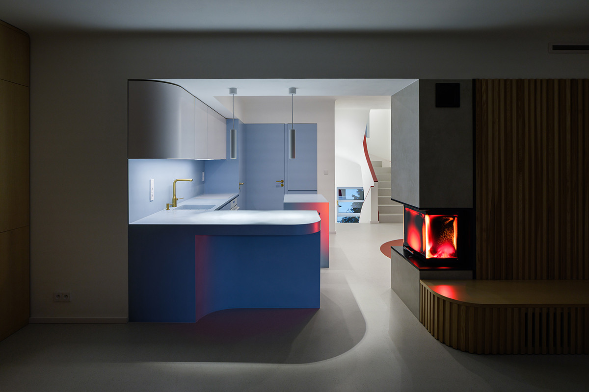 Spojnicí asketického vnějšku s bohatým vnitřním životem domu jsou hliníková okna a dveře, jejichž speciálně namíchaná modrá barva se rozlévá nejen na vnitřní i vnější parapety, ale napouští svou atmosférou celý dům. V domě se lze setkat se třemi jemně rozdílnými interiéry - společnou částí a se dvěma byty. Interiéry spojuje záměrná čistota a chirurgická přesnost nábytkových řešení. Jejím odrazem je i nenápadná tenká červená linka vinoucí se jako tepna po zábradlí, hranách soklů, futer i nábytku v části interiéru.