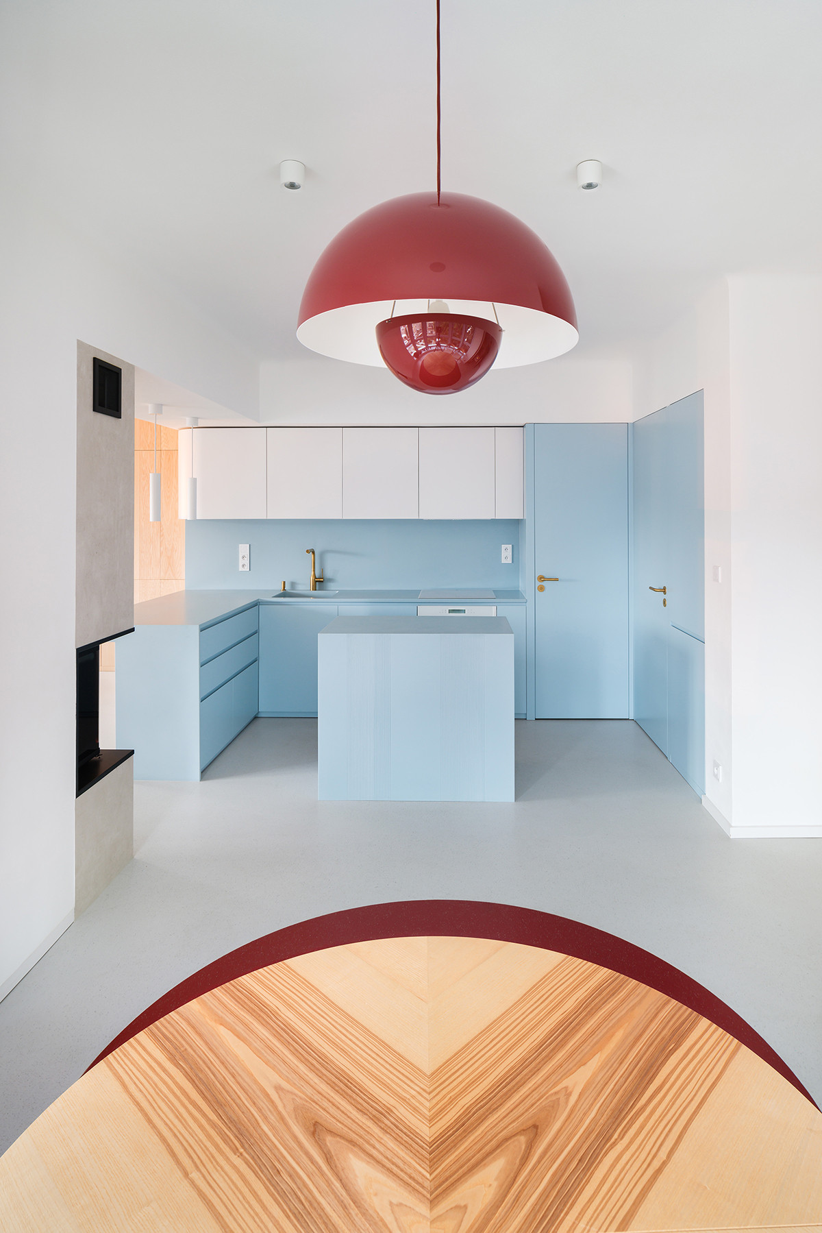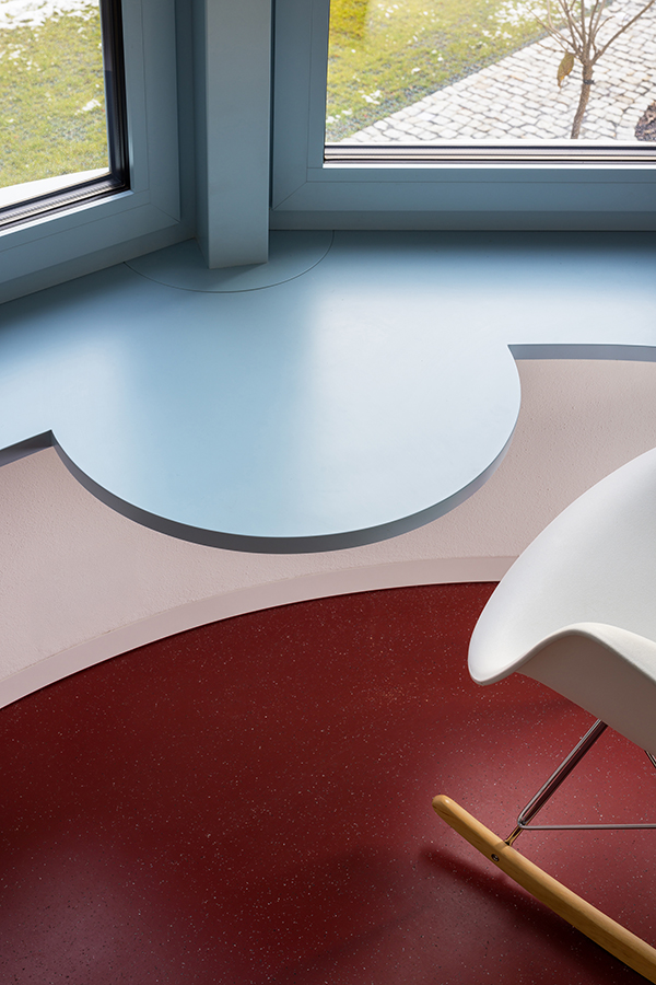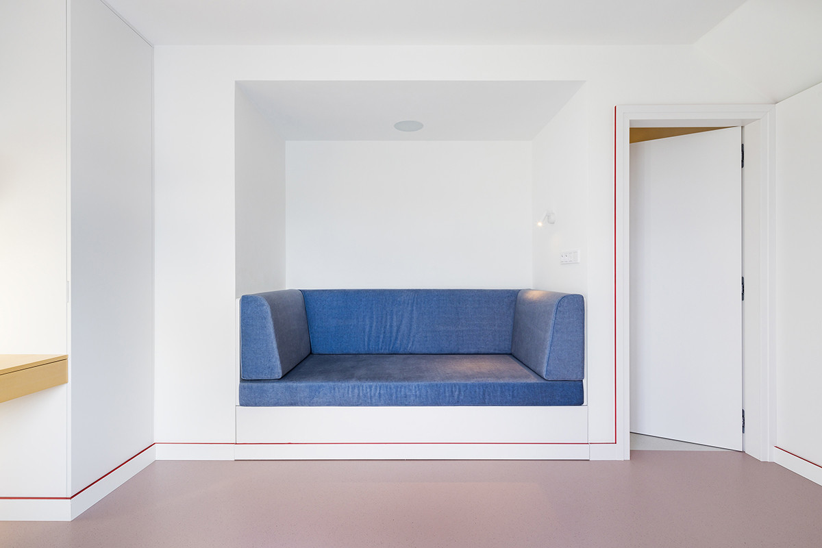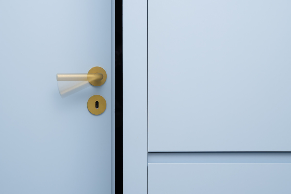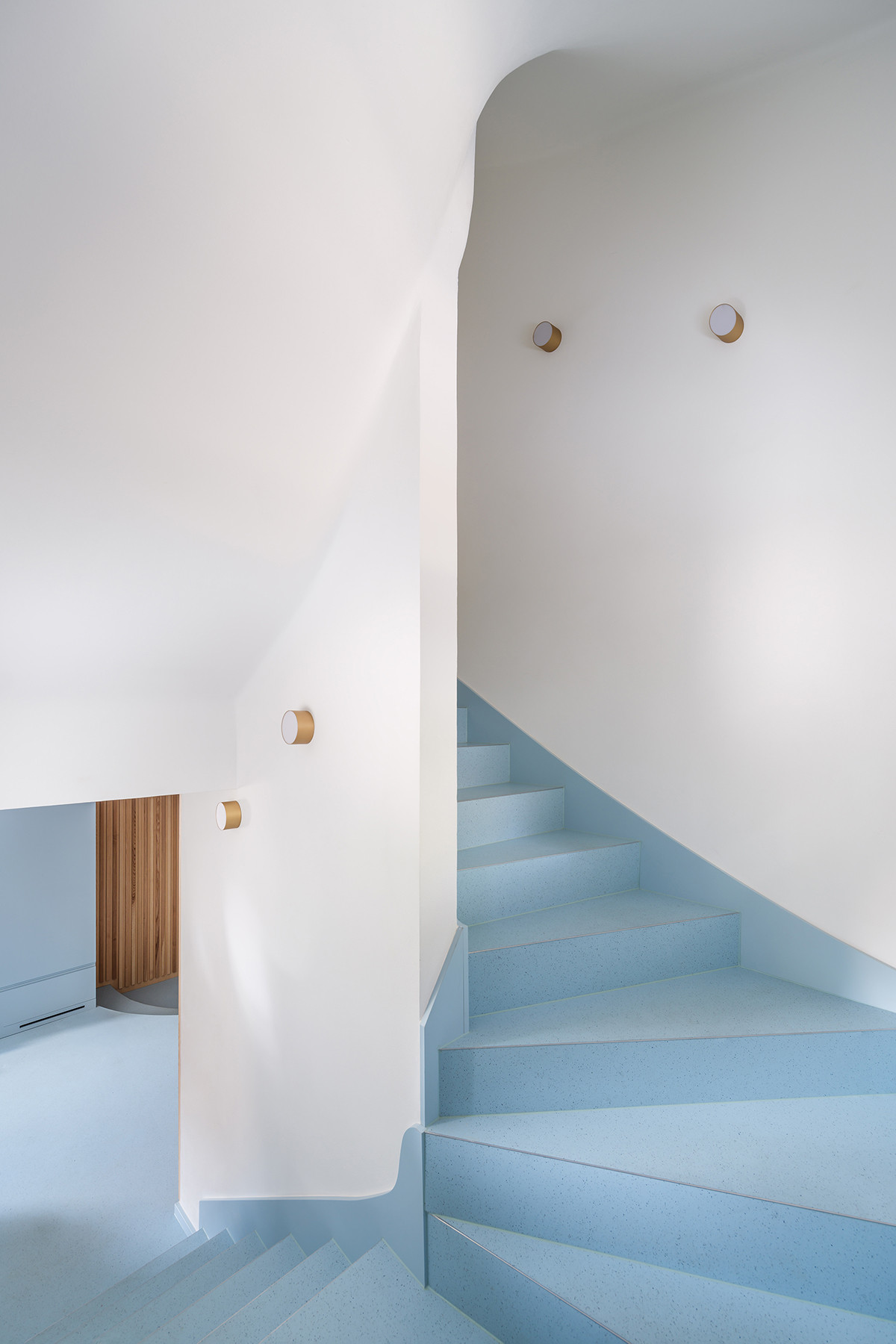 Spojnicí asketického vnějšku s bohatým vnitřním životem domu jsou hliníková okna a dveře, jejichž speciálně namíchaná modrá barva se rozlévá nejen na vnitřní i vnější parapety, ale napouští svou atmosférou celý dům. V domě se lze setkat se třemi jemně rozdílnými interiéry - společnou částí a se dvěma byty. Interiéry spojuje záměrná čistota a chirurgická přesnost nábytkových řešení. Jejím odrazem je i nenápadná tenká červená linka vinoucí se jako tepna po zábradlí, hranách soklů, futer i nábytku v části interiéru.