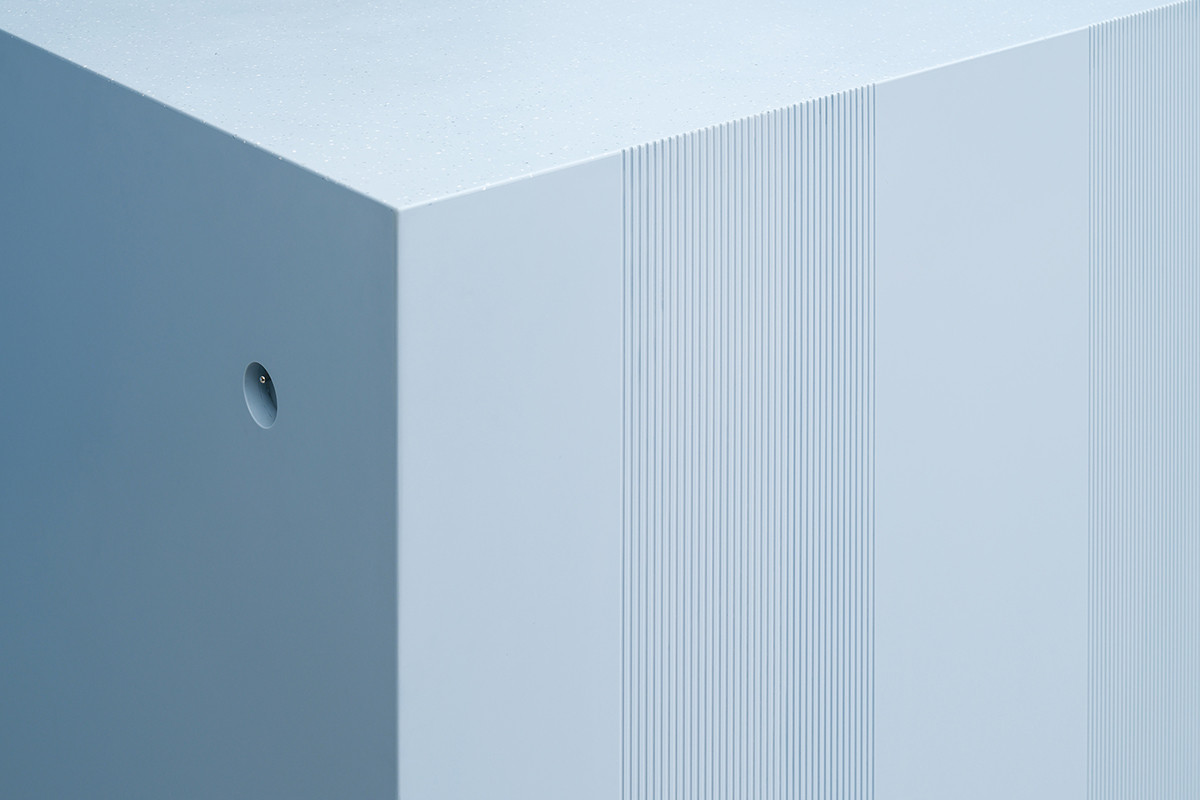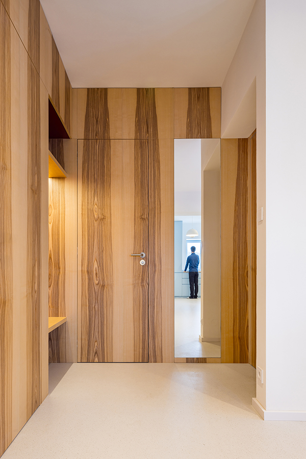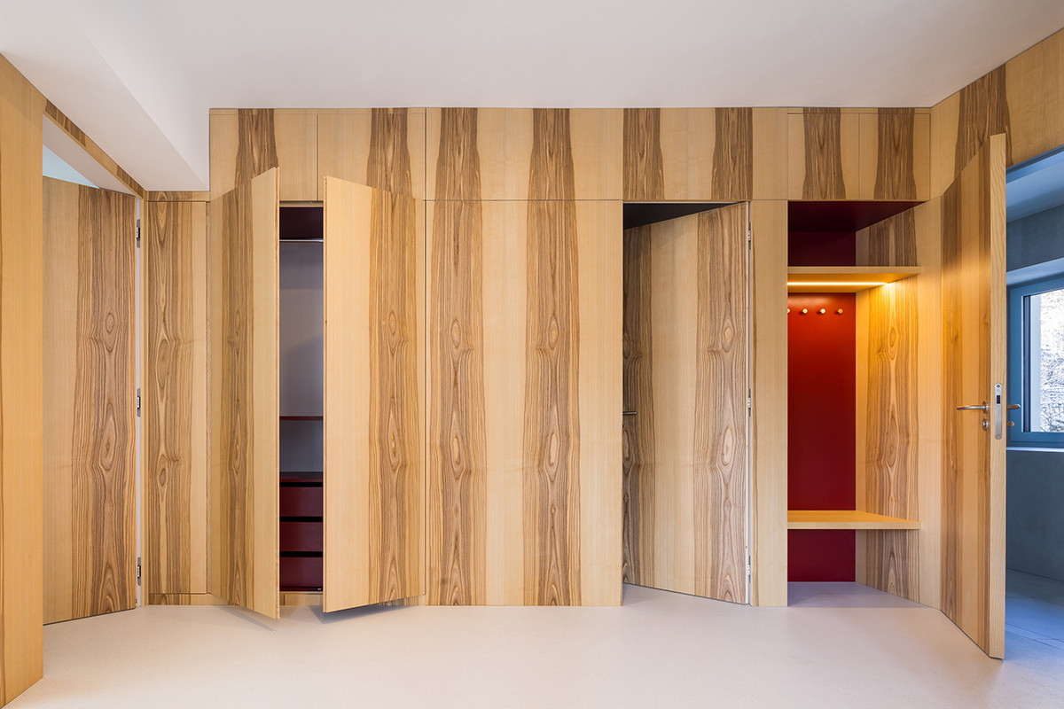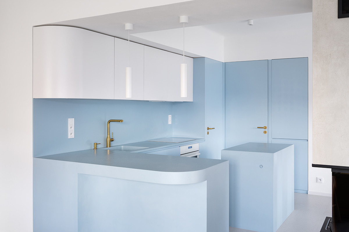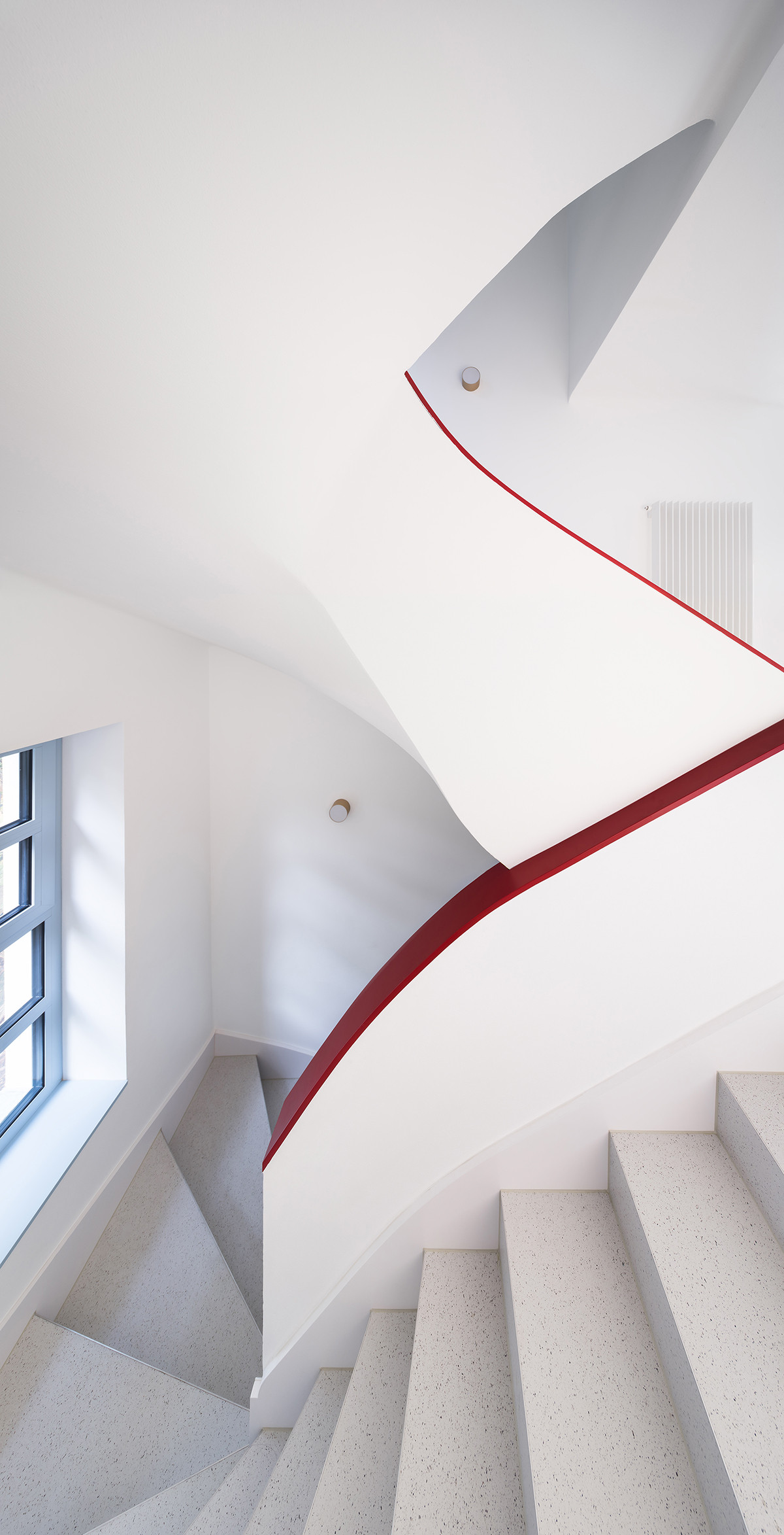Spojnicí asketického vnějšku s bohatým vnitřním životem domu jsou hliníková okna a dveře, jejichž speciálně namíchaná modrá barva se rozlévá nejen na vnitřní i vnější parapety, ale napouští svou atmosférou celý dům. V domě se lze setkat se třemi jemně rozdílnými interiéry - společnou částí a se dvěma byty. Interiéry spojuje záměrná čistota a chirurgická přesnost nábytkových řešení. Jejím odrazem je i nenápadná tenká červená linka vinoucí se jako tepna po zábradlí, hranách soklů, futer i nábytku v části interiéru.